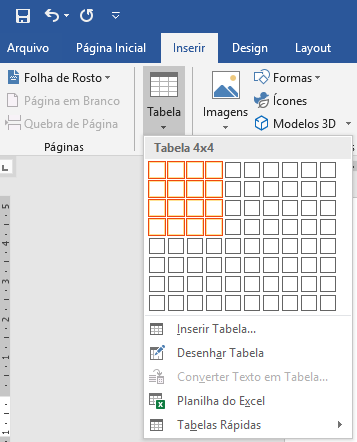 Na guia Inserir existe o comando Tabela.