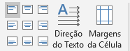 O grupo de Alinhamento nos possibilita estabelecer o alinhamento (horizontal e vertical) do texto da célula. Além disso, podemos estabelecer a direção em que o texto será escrito (com as mesmas possibilidades de alinhamento. Por último, Margens da Célula nos apresenta as margens internas da célula e espaçamento entre células, onde podemos realizar os ajustes necessários.