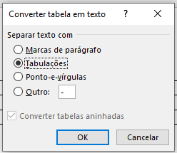 Converter em Texto faz com que nossa tabela seja transformada em um texto normal, onde temos a possibilidade de escolhermos qual caractere será o responsável pela separação das colunas. Vale apontar que se possuirmos um texto onde as colunas são separadas por tabulações, selecionar esse texto e usar o comando Inserir Tabela fará com que o texto seja convertido em uma tabela. O Word ainda nos permite inserirmos fórmulas em nossas tabelas, porém, essa possibilidade deve ser bem analisada e utilizada para fórmulas simples. No caso de tabelas com fórmulas complexas, prefira sempre utilizar o Excel, até porque ambos fazem parte do pacote Microsoft Office.