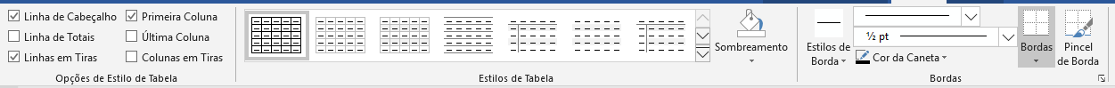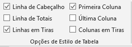 Nessa guia são apresentadas as ferramentas relativas ao design da tabela como um todo.Aqui podemos configurar as propriedades de nossa tabela com relação à formatação de linhas e colunas. Essas configurações refletem diretamente nos Estilos de Tabela, apresentados no grupo ao lado desse.