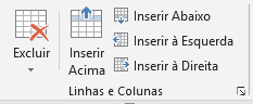 Em Excluir, podemos decidir entre excluir as células selecionadas, a coluna ou a linha onde está a célula selecionada ou até mesmo excluir toda a tabela. Ao lado temos ações de inclusão acima ou abaixo de onde está a célula selecionada, tanto para linhas como para colunas.