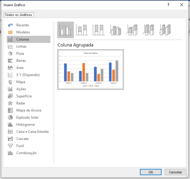 Na Guia Inserir temos a opção Gráfico, que nos permitirá escolher entre diversos tipos de gráficos. Posicione o cursor onde deseja inserir o gráfico e escolha na lista à esquerda o tipo de gráfico que melhor representa a informação que você quer divulgar. Depois, no quadro à direita verifique qual gráfico, dentro do grupo escolhido, representa os dados. Após isso, basta clicar em OK