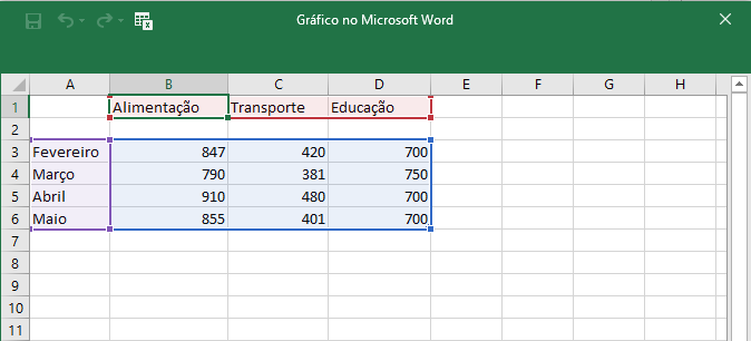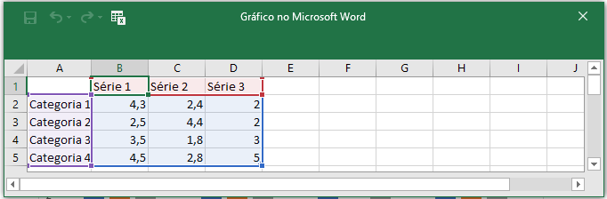Utilize essa planilha para inserir os dados que formatarão o gráfico, inserindo ou excluindo linhas e colunas, conforme sua necessidade.Note que os dados inseridos formam o design do gráfico. A partir daí você poderá ir verificando no desenho do gráfico como ele está sendo formado e se está atendendo às suas necessidades.