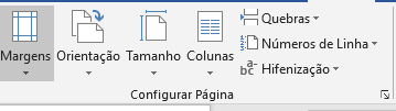 Temos nessa grupo predefinições para as margens, orientação e tamanho do papel, que definem informações relativas às folhas e ao documento como um todo. Para tal, podemos utilizar essas sugestões ou clicar na pequena seta no canto inferior direito do grupo, para acessarmos a tela de configurações com maiores possibilidades e opções.