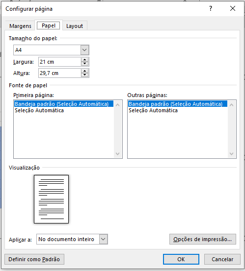 As configurações definidas para o documento refletirão na forma como o documento será apresentado tanto na tela como em uma folha impressa.
