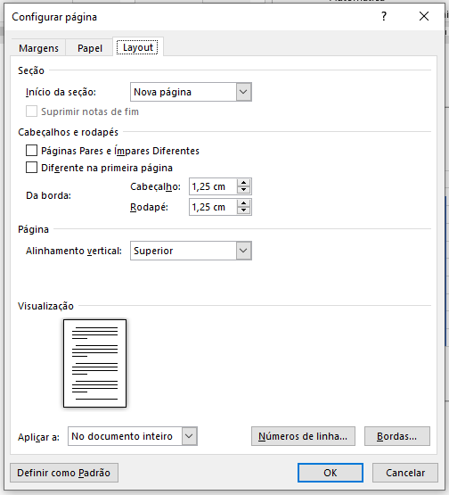 Em Números de linhas definimos se iremos numerar as linhas do documento, em que número elas iniciarão e se terão um reinício a cada página.