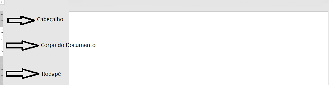 Na imagem abaixo, o corpo do documento teve a parte do meio cortada, aparecendo somente as partes superior e inferior (a numeração na régua demonstra isso). Perceba na régua que tanto o cabeçalho como o rodapé aparecem demarcados com a cor cinza, enquanto o corpo do documento aparece na cor branca.Portanto, para acessar o cabeçalho/rodapé do documento, basta que você dê um duplo clique na página, na região do cabeçalho ou do rodapé. A partir daí, você poderá navegar entre o cabeçalho e o rodapé livremente. O corpo do documento ficará inacessível, para que você execute a configuração da outra área do documento.