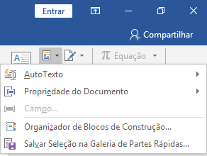 Lembra que falamos em inserirmos informações importantes no documento, como autor, onde está gravado o documento etc.? Isso é possível clicando em Partes Rápidas, na guia Inserir, grupo Texto. AutoTexto nos é útil quando utilizamos um texto frequentemente, como o endereço da empresa, por exemplo. Para criar um AutoTexto, digite o texto desejado normalmente (você vai ter que digitá-lo ao menos na primeira vez), selecione-o e vá .em Partes Rápidas >> AutoTexto. Escolha a opção ao final da tela: Salvar Seleção na Galeria de AutoTexto.