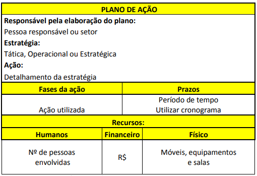 Tajra, ainda diz que “o conjunto de todos os planos de ação constitui o planejamento operacional de uma organização”. (TAJRA). Este documento é a base para o cumprimento das atividades pelo nível operacional da organização. Segue abaixo no quadro 2 o modelo de plano de ação: