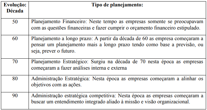 Observa-se através do quadro um mencionado acima que a evolução do planejamento desde a década de cinqüenta até os dias de hoje é fundamental para organizações controlar seus recursos financeiros e fazer uma análise criteriosa do ambiente interno e externo além do mais definir sua missão e visão.