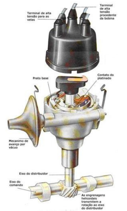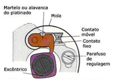 Os principais componentes deste mecanismo podem ser vistos na figura 9.Neste sistema, existe um par de contatos (um móvel e outro fixo, platinados), ligados ao enrolamento primário e à massa, montados no interior do corpo do distribuidor.