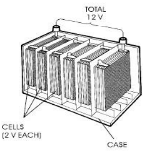 Tipicamente, ela está dividida em compartimentos separados denominados por células. Cada célula produz aproximadamente 2V quando a bateria está totalmente carregada, portanto para se obter 12V são precisas 6 células, como se pode ver na figura 2.