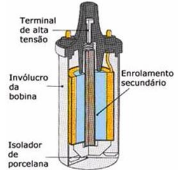 O enrolamento secundário está conectado à cabeça do distribuidor, que por sua vez direciona a corrente às velas de ignição através dos cabos de alta tensão. Na figura 4 pode-se visualizar o aspecto de uma bobina de ignição.