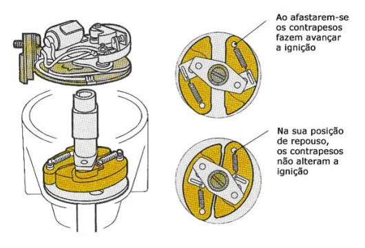 Consiste num par de contrapesos que se mantêm junto ao eixo do distribuidor por ação de molas. A força centrifuga, atuando nos contrapesos, afasta-os progressivamente do eixo à medida que a velocidade do motor vai aumentando.