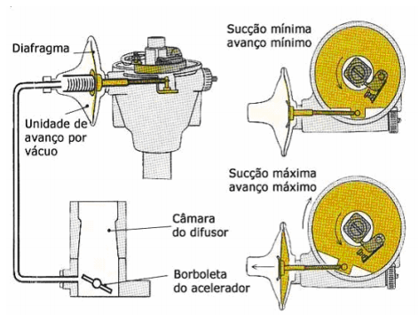 Funciona por meio do vácuo criado no colector de admissão. Ao abrir-se a borboleta, a sucção atua sobre um diafragma, o que faz antecipar o momento em que se dá a faísca, modificando a posição dos platinados em relação ao excêntrico.Com a borboleta completamente aberta, a força exercida sobre o diafragma é reduzida e verifica-se um menor avanço por vácuo. Este mecanismo pode ser analisado na figura 13.