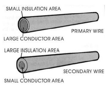 Em contraste, os cabos do secundário são usados para transportar pequenas correntes mas a elevadas tensões. Estes cabos são feitos de condutor com pequeno diâmetro e cobertos com uma grossa camada de isolamento de borracha ou plástico.A figura 15 mostra uma comparação entre estes dois tipos de cabos.