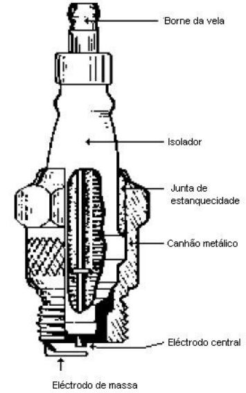 Como se pode observar na figura 16 uma vela é constituída por um canhão metálico, que permite a fixação ao bloco motor e que tem na sua extremidade um eléctrodo de massa, tem ainda um eléctrodo central com uma das extremidades ligada ao cabo de alta tensão e outra por onde salta a faísca. Um isolante separa o eléctrodo central do canhão metálico.