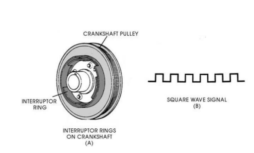 O sensor de efeito-Hall trabalha da mesma forma que um sensor magnético, contudo, em vez de enviar um sinal em tensão alternada para a ECU, envia um impulso de corrente. Um anel interruptor é colocado na roldana da cambota como mostra a figura 20(A).Este anel contém três lâminas igualmente espaçadas, quando a cambota se encontra em rotação e as lâminas passam pelo sensor, este envia um impulso de tensão para a ECU. O tipo de impulsos gerado pela saída do sensor pode ser visto na figura 20(B).