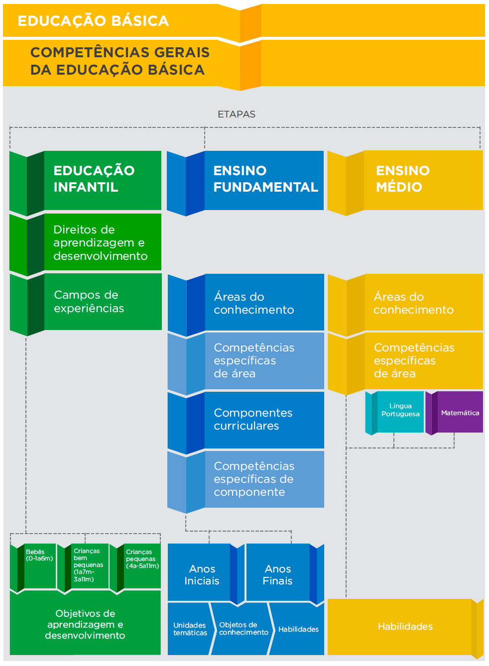 A estrutura geral da BNCC para as três fases da Educação Básica (Educação Infantil, Ensino Fundamental e Ensino Médio). Lembrando que as dez competências gerais da Educação Básica devem ser trabalhadas ao longo dessas etapas: