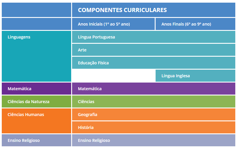 Veja a seguir uma lista onde cada componente curricular está presente na BNCC Ensino Fundamental - Anos Iniciais e Anos Finais.