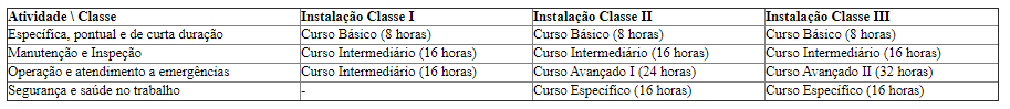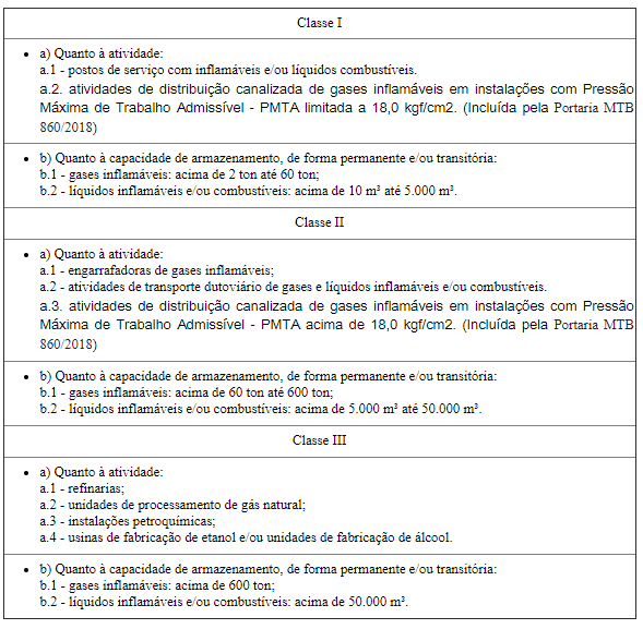 20.4.1 Para efeito desta NR, as instalações são divididas em classes, conforme Tabela 1.