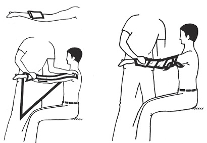 - Colocar a bandagem triangular paralela ao braço, segurando o vértice no pulso e colocando uma das pontas no ombro.