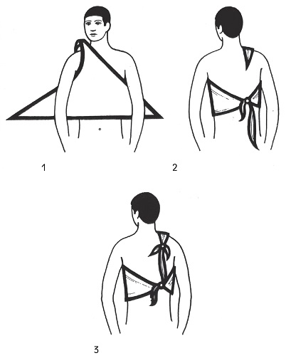 Bandagem triangular: Na prestação dos primeiros socorros, a bandagem triangular é o recurso de maior utilidade, uma vez que pode ser improvisada facilmente, com qualquer pedaço de pano.