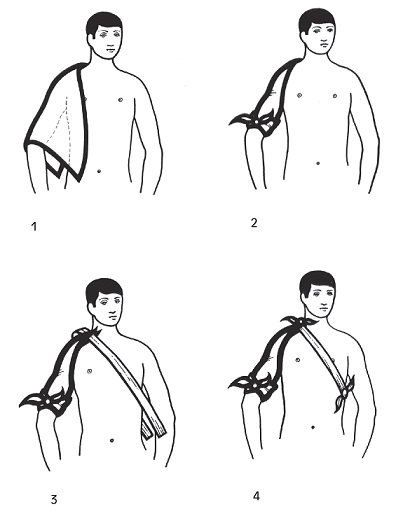 - Tomar a ponta livre da bandagem e ir envolvendo o braço até o ombro, terminando por fazer um nó com a outra ponta.