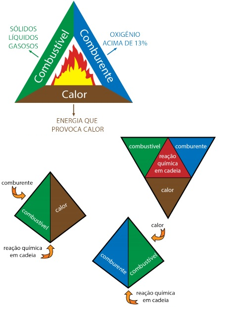 A teoria nos diz que são 3 elementos básicos: combustível, comburente e calor. Esses três elementos, reagindo em cadeia, dão origem ao fogo. A literatura denomina esses elementos, bem como a relação entre eles, por triângulo do fogo ou tetraedro do fogo (este último mais recente, considerando, também, a reação em cadeia).