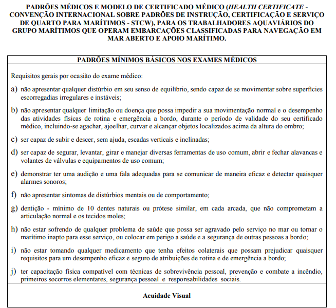 Para aos trabalhadores aquaviários que atuem em embarcações a mar aberto, devem ser empregues padrões médico e modelos de Certificado Médico (Health Certificate - Convenção Internacional sobre Padrões de Instrução, Certificação e Serviço de Quarto para Marítimos - STCW) estabelecidos no QUADRO III dessa NR.