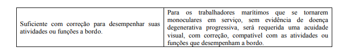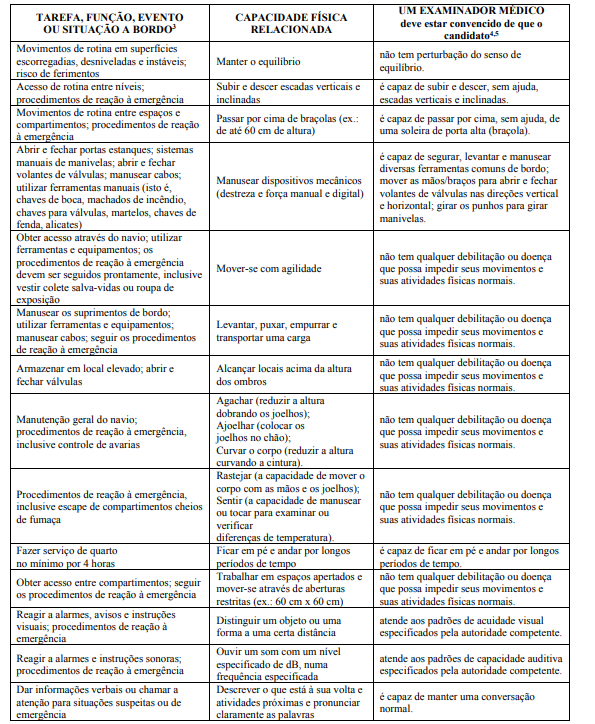 1. A tabela acima descreve (a) as tarefas, funções, eventos e situações normais a bordo, (b) uma capacidade física correspondente que é considerada necessária para a segurança de um marítimo que esteja vivendo e trabalhando a bordo de um navio no mar, e (c) uma diretriz para medir a capacidade física correspondente. As Administrações devem levar em conta estas capacidades físicas ao estabelecer os padrões de aptidão médica.