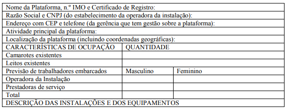 37.5.2.1 Se ocorrer mudança da locação da plataforma, a operadora da instalação ficará dispensada de providenciar nova DIM, devendo protocolizar tanto na SRTb de origem como na de destino, antes de iniciar o seu deslocamento, documento contendo as seguintes informações: a) razão social e CNPJ da operadora da concessão;