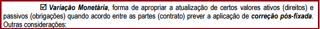 Não existe índice único fixado por lei para calcular a variação, podendo ser utilizado o IGP, IPC, IGP-M, UFIR, de acordo com o pactuado; Não existe lei fixando o elenco de contas próprias sujeitas à variação; Ocorre, também, com base em moeda estrangeira (o dólar, por exemplo), hipótese em que é contabilizada com o título de Variação Cambial.