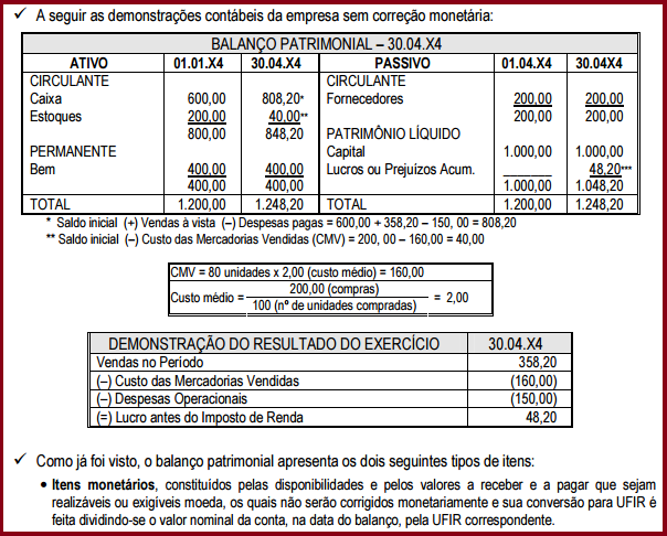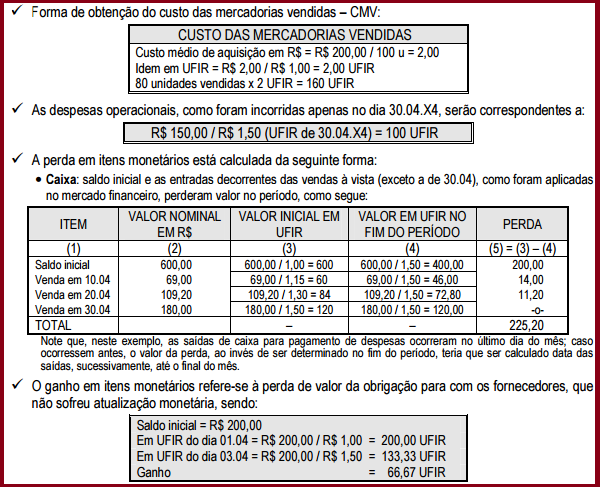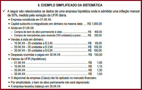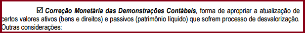 • defasagem nos valores de ativos não monetários que não são corrigidos pela legislação atual, tais como estoques, despesas antecipadas, alguns tipos de adiantamentos, etc.