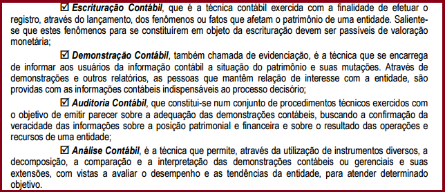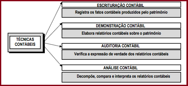 Sabendo-se que a Contabilidade é uma ciência e que a mesma é conceituada e estudada de forma abstrata, constata-se que a sua materialização ou concretização se dá através de suas técnicas, quais sejam: