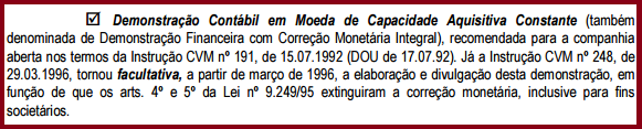 Nos termos da alteração introduzida pelo art. 1º da Instrução CVM nº 201/93 (revogada pela Instrução CVM nº 248/96), as companhias abertas ficam autorizadas a publicar exclusivamente em moeda de capacidade aquisitiva constante (Correção Integral) as Demonstrações Contábeis e o Relatório da Administração, desde que encerradas a partir de dezembro de 1993 e atendidas as prescrições estabelecidas na Instrução CVM nº 191/92.