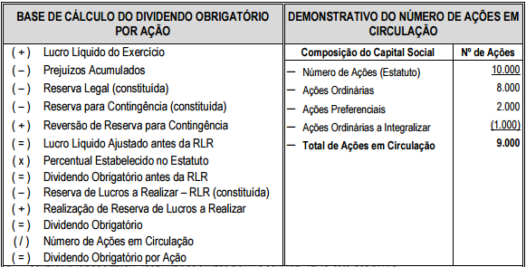 • base, forma de cálculo e montante do dividendo obrigatório das participações no lucro e da provisão para o imposto de renda e contribuição social.
