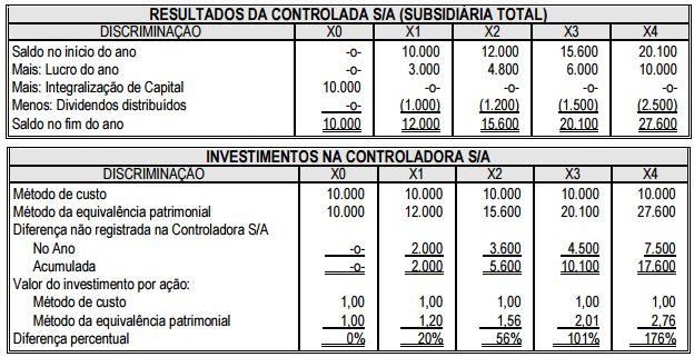 Gráfico de visualização e efeitos das transações no patrimônio líquido da controlada