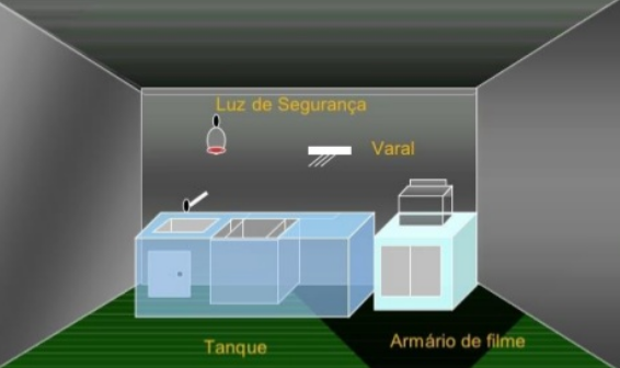 Especialmente construída, apresentando as condições essenciais para a revelação, ou seja, a prova de luz, higiene, boas ventilação.