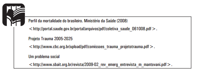 SOUSA, R. M. C.; CALIL, A. M.; PARANHOS, W. Y.; MALVESTIO, M. A. Atuação no trauma – uma abordagem para a enfermagem. São Paulo: Atheneu, 2009.