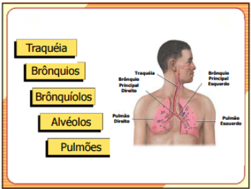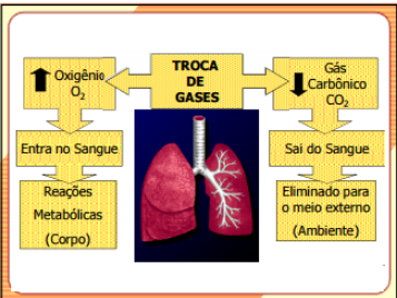 O ar inspirado, rico em oxigênio, passa pelas vias respiratórias, sendo filtrado, umedecido, aquecido e levado aos pulmões. No íntimo pulmonar o oxigênio do ar inspirado entra na circulação sanguínea e o dióxido de carbono do sangue venoso é liberado nos alvéolos para que seja eliminado com o ar expirado. O ar expirado é pobre em oxigênio, rico em dióxido de carbono e segue caminho oposto pelo trato respiratório.