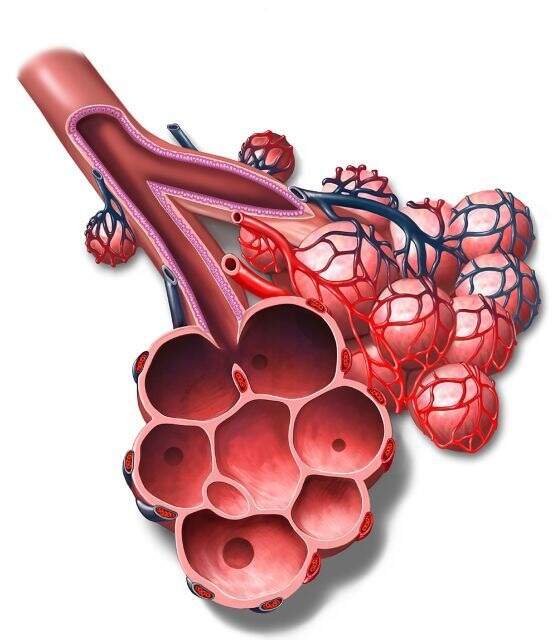Estes constituintes configuram sacos de ar muito pequenos e ocos. Cada alvéolo é cercado por um capilar pulmonar. O oxigênio passa através das paredes finas dos alvéolos aos capilares e o dióxido de carbono passa dos capilares aos alvéolos. Cada pulmão de adulto, em média, contém cerca de trezentos milhões de alvéolos.