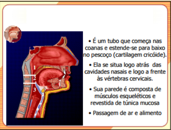 É um tubo muscular associado a dois sistemas: respiratório e digestivo, situando-se posteriormente à cavidade nasal, cavidade bucal e laringe. É um canal que é comum à passagem de ar inspirado e de alimentos ingeridos.