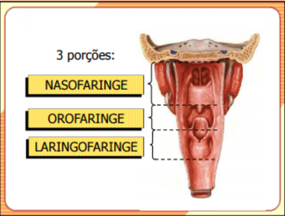 Mais inferior é a região laringofaríngea, que se comunica com a entrada da laringe (no sistema respiratório) e mais abaixo com a abertura do esôfago (no sistema digestório).