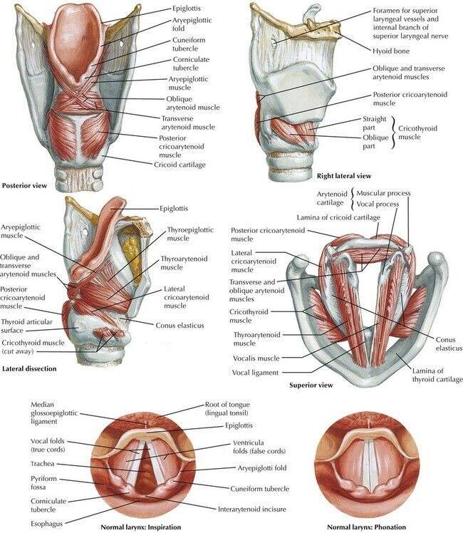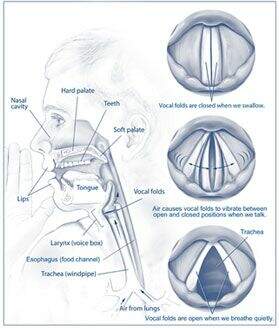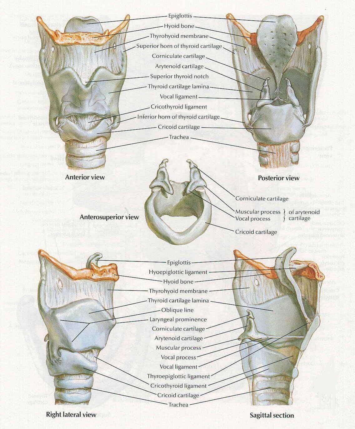 Em linhas gerais, a laringe, então, tem importante função ao impedir a entrada de alimento nas vias aéreas inferiores e garantir a fonação. No homem, é formada por nove peças de cartilagem: a cartilagem tireoide, localizada anteriormente e em forma de duas placas formando um diedro, esta é a cartilagem da laringe que forma a proeminência laríngea ou pomo-de-adão; inferiormente instala-se a cartilagem cricóide, que possui um formato de anel e conecta-se com a extremidade superior da traqueia; posteriores à cartilagem tireoide está o par de cartilagens aritenoides, que são presas à região supero-posterior da cartilagem cricóide; fixas sobre cada cartilagem aritenoide encontra-se uma cartilagem corniculada; anteriores às cartilagens aritenoides e posteriores à cartilagem tireoide encontram-se as duas cartilagens cuneiformes; e por cima da estrutura da laringe se encontra a cartilagem epiglótica, mobilizável pelos músculos da laringe para fechar a epiglote durante a deglutição. Todas essas cartilagens são unidas por tecido fibroso e músculos. As pregas vocais (cordas vocais) são duas pregas músculo-membranosas presentes na parede posterior da cartilagem tireoide, que aumentam ou reduzem a luz da rima da glote (abertura entre as pregas vocais) produzindo sons durante a passagem de ar.