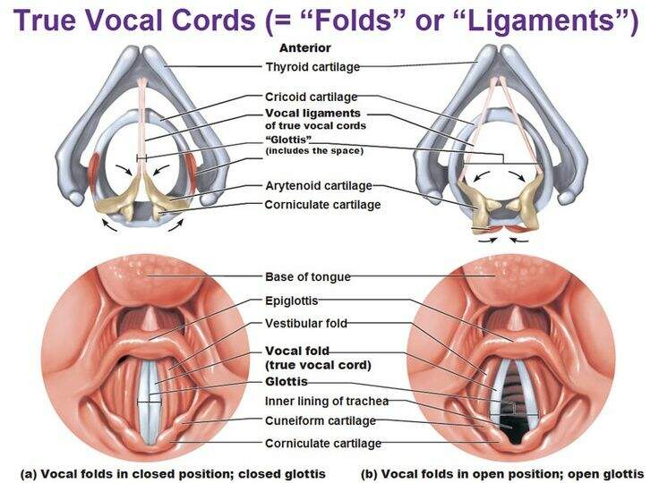No momento em que estamos respirando normalmente, as pregas vocais apresentam-se separadas e formam uma abertura com formato triangular entre elas. Quando as pregas vibram, no momento da fonação, elas ficam muito próximas uma da outra.