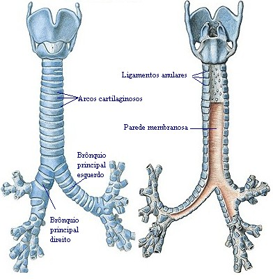 Seguindo à laringe, encontra-se a traqueia, que é um tubo flexível constituída por uma série de anéis cartilagíneos incompletos, em forma de C, sobrepostos e ligados entre si, os quais fornecem a rigidez que impede a traqueia de colapsar. A parede posterior desprovida de cartilagem é constituída de tecido conjuntivo e musculatura lisa, que permite elasticidade durante os movimentos ventilatórios. É revestida pelas células produtoras de muco e cílios que filtram o ar antes de entrar nos brônquios. Embora seja um tubo mediano, sofre um ligeiro desvio para a direita, próximo da sua extremidade inferior, antes de se dividir nos dois brônquios principais, direito e esquerdo, que se dirigem aos pulmões.