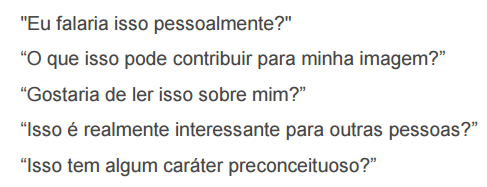 Uma boa dica para não errar é fazer algumas perguntas antes de publicar algo, como: