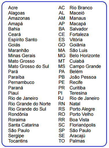 Abreviações de Estados, Territórios e Distrito Federal e suas respectivas Capitais:
