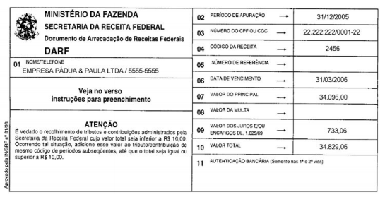 Documento de Arrecadação da Receita Federal. É o boleto utilizado para pagamento de tributos à Receita Federal. É preenchido em duas (2) vias e, em casos especiais, pode ser preenchido em um número maior de vias, à maquina ou em letra de forma.